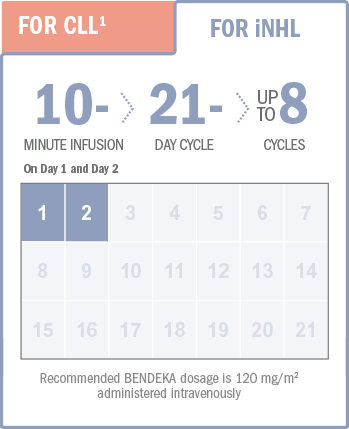 BENDEKA is indicated for the treatment of patients with chronic lymphocytic leukemia (CLL) — efficacy relative to first-line therapies other than chlorambucil has not been established — or patients with indolent B-cell non-Hodgkin lymphoma (NHL) that has progressed during or within six months of treatment with rituximab or a rituximab-containing regimen.
